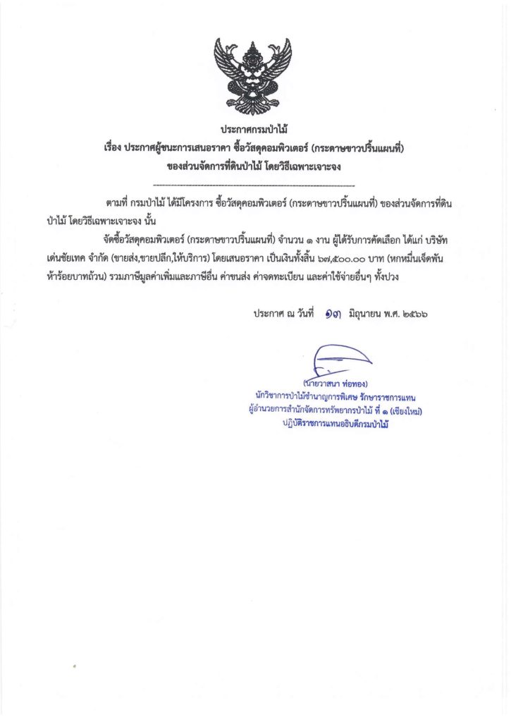 ประกาศกรมป่าไม้ เรื่อง ประกาศผู้ชนะการเสนอราคา ซื้อวัสดุคอมพิวเตอร์ (กระดาษขาวปริ้นแผนที่) ของส่วนจัดการที่ดินป่าไม้ โดยวิธีเฉพาะเจาะจง