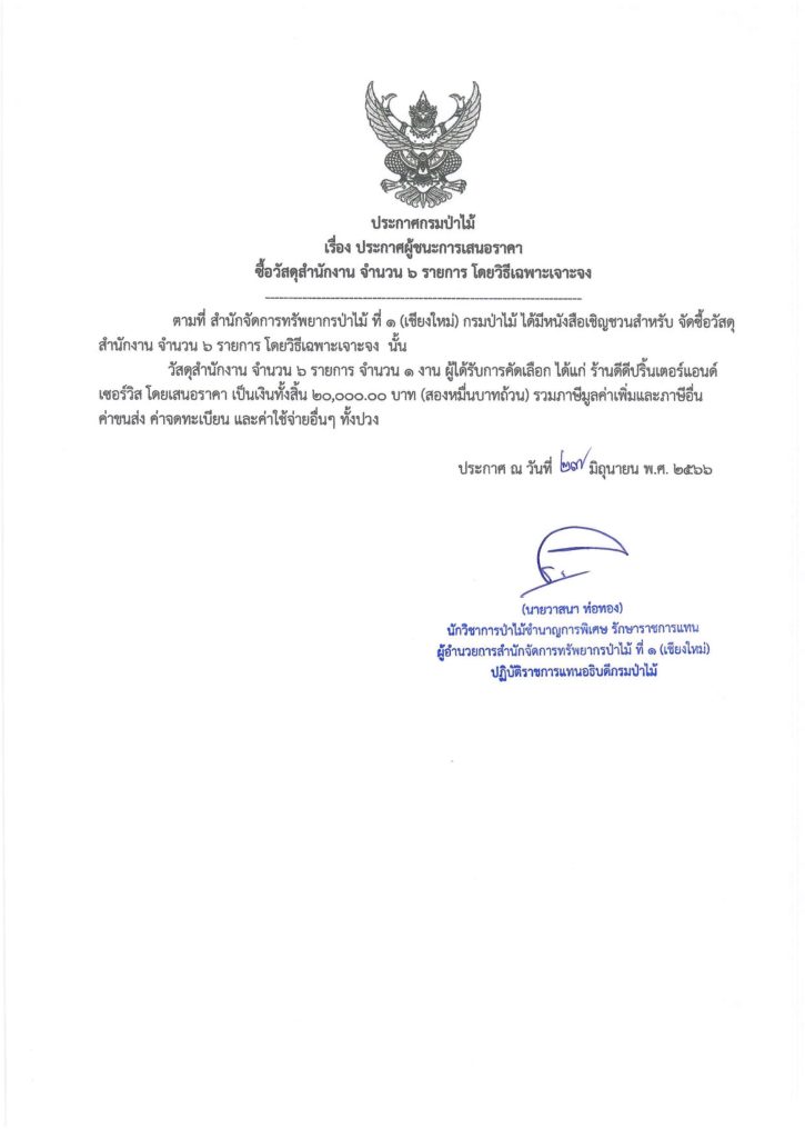 ประกาศกรมป่าไม้ เรื่อง ประกาศผู้ชนะการเสนอราคาซื้อวัสดุสำนักงาน จำนวน ๖ รายการ โดยวิธีเฉพาะเจาะจง27 มิถุนายน 2023 ใน ประกาศจัดซื้อจัดจ้าง by adminir