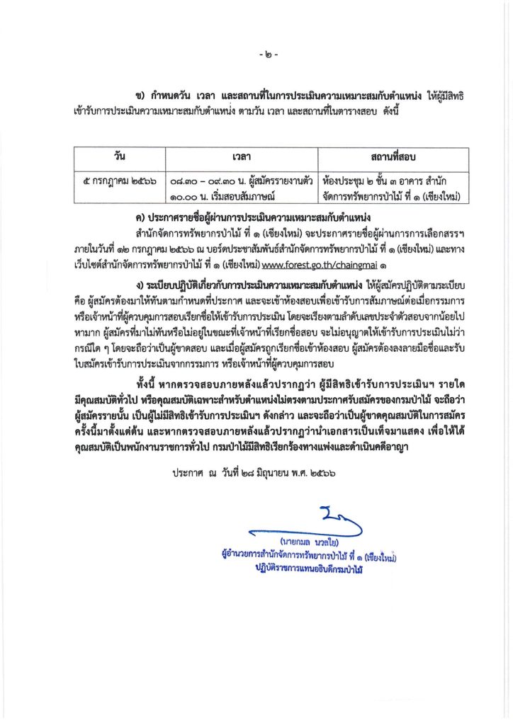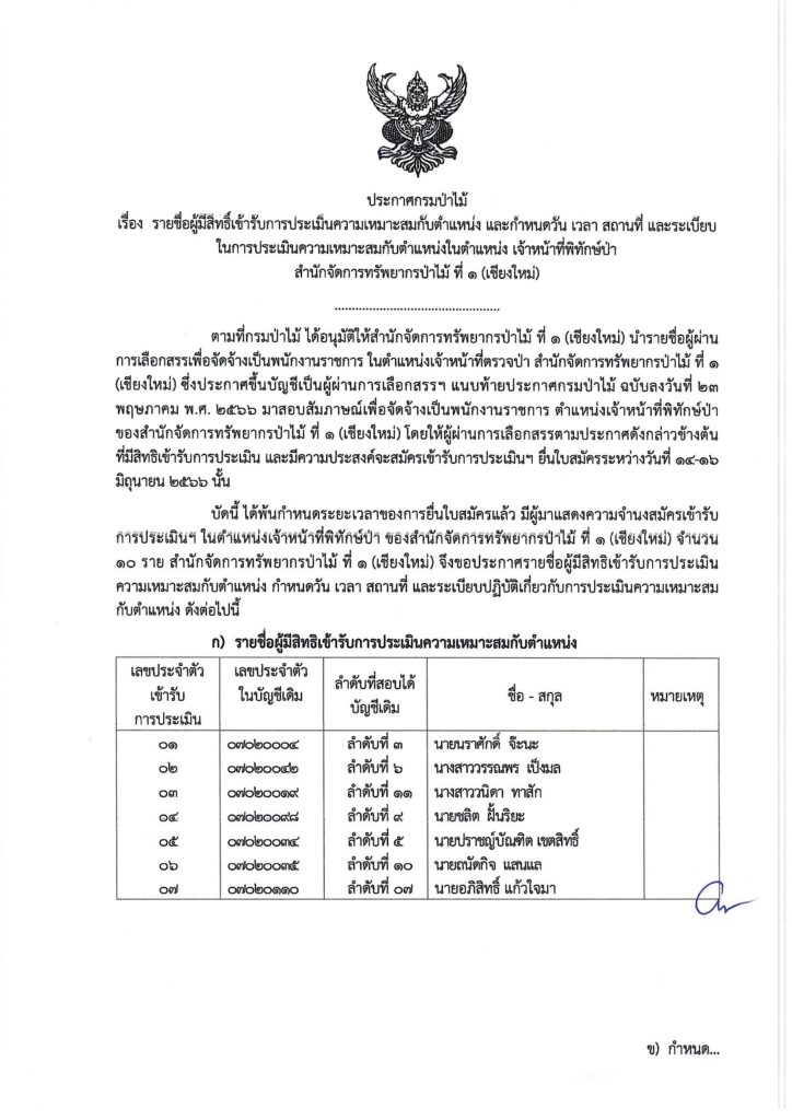 หน้าแรก » ประกาศ » ประกาศกรมป่าไม้ เรื่อง รายชื่อผู้มีสิทธิ์เข้ารับการประเม็นความเหมาะสมกับตำแหน่ง และกำหนดวัน เวลา สถานที่ และระเบียบ ในการประเมินความเหมาะสมกับตำแหน่งในตำแหน่ง เจ้าหน้าที่พิทักษ์ป่า สำนักจัดการทรัพยากรป่าไม้ ที่ ๑ (เชียงใหม่)