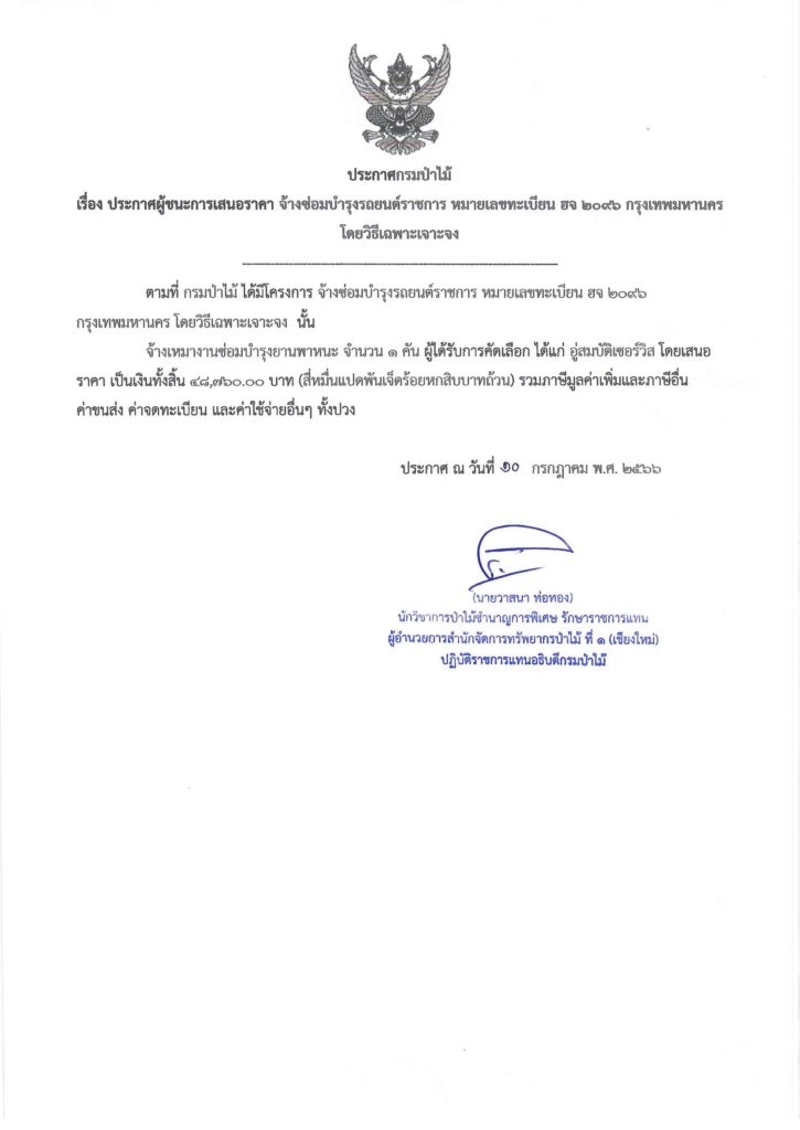 ประกาศกรมป่าไม้ เรื่อง ประกาศผู้ชนะการเสนอราคา จ้างซ่อมบำรุงรถยนต์ราชการ หมายเลขทะเบียน ฮจ ๒๐๙๖ กรุงเทพมหานครโดยวิธีเฉพาะเจาะจง11 กรกฎาคม 2023 ใน ประกาศจัดซื้อจัดจ้าง by adminir