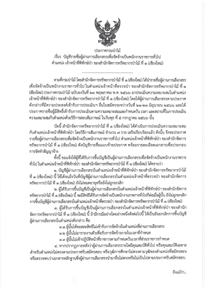 ประกาศกรมป่าไม้ เรื่อง บัญชีรายชื่อผู้ผ่านการเลือกสรรเพื่อจัดจ้างเป็นพนักงานราชการทั่วไป ตำแหน่ง เจ้าหน้าที่พิทักษ์ป่า ของสำนักจัดการทรัพยากรป่าไม้ ที่ ๑ (เชียงใหม่)12 กรกฎาคม 2023 ใน ประกาศ by adminir