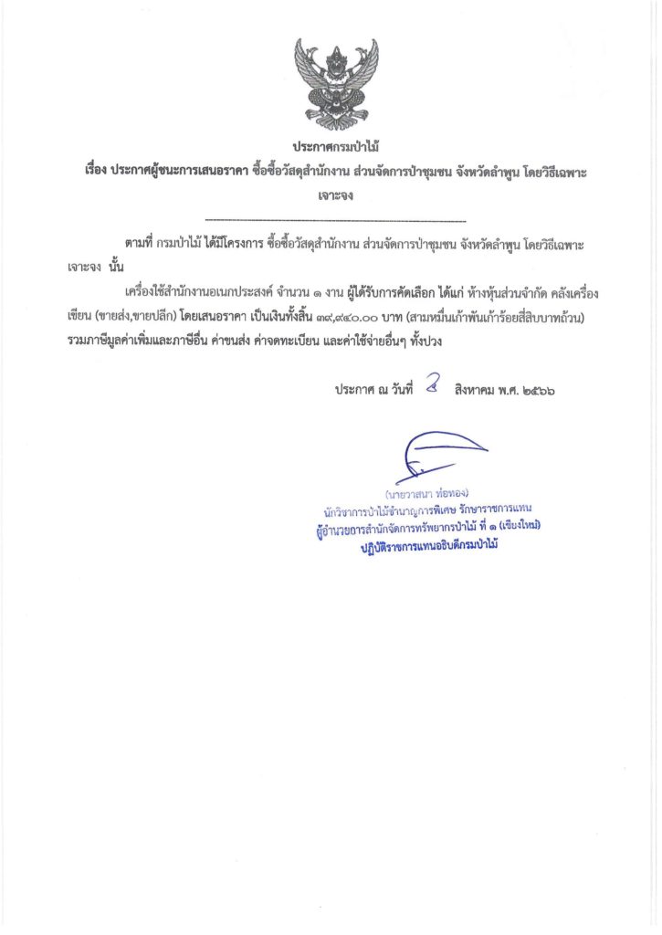 ประกาศกรมป่าไม้ เรื่อง ประกาศผู้ชนะการเสนอราคา ซื้อซื้อวัสดุสำนักงาน ส่วนจัดการป่าชุมชน จังหวัดลำพูน โดยวิธีเฉพาะเจาะจง4 สิงหาคม 2023 ใน ประกาศจัดซื้อจัดจ้าง by adminir