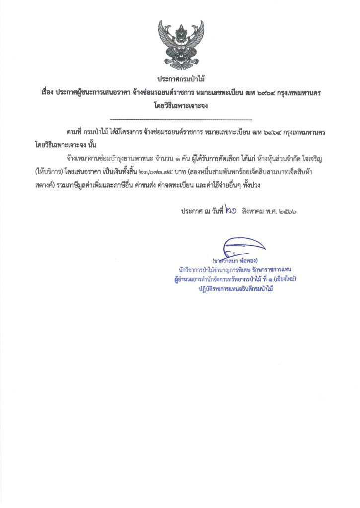 ประกาศกรมป่าไม้ เรื่อง ประกาศผู้ชนะการเสนอราคา จ้างซ่อมรถยนต์ราชการ หมายเลขทะเบียน ฒห ๖๙๖๔ กรุงเทพมหานครโดยวิธีเฉพาะเจาะจง21 สิงหาคม 2023 ใน ประกาศจัดซื้อจัดจ้าง by adminir