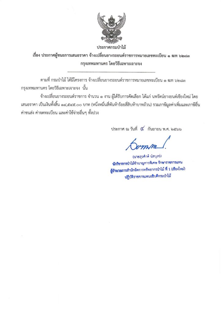 ประกาศกรมป่าไม้ เรื่อง ประกาศผู้ชนะการเสนอราคา จ้างเปลี่ยนยางรถยนต์ราชการหมายเลขทะเบียน ๑ ฒท ๖๒๘๓ กรุงเทพมหานคร โดยวิธีเฉพาะเจาะจง4 กันยายน 2023 ใน ประกาศจัดซื้อจัดจ้าง by adminir