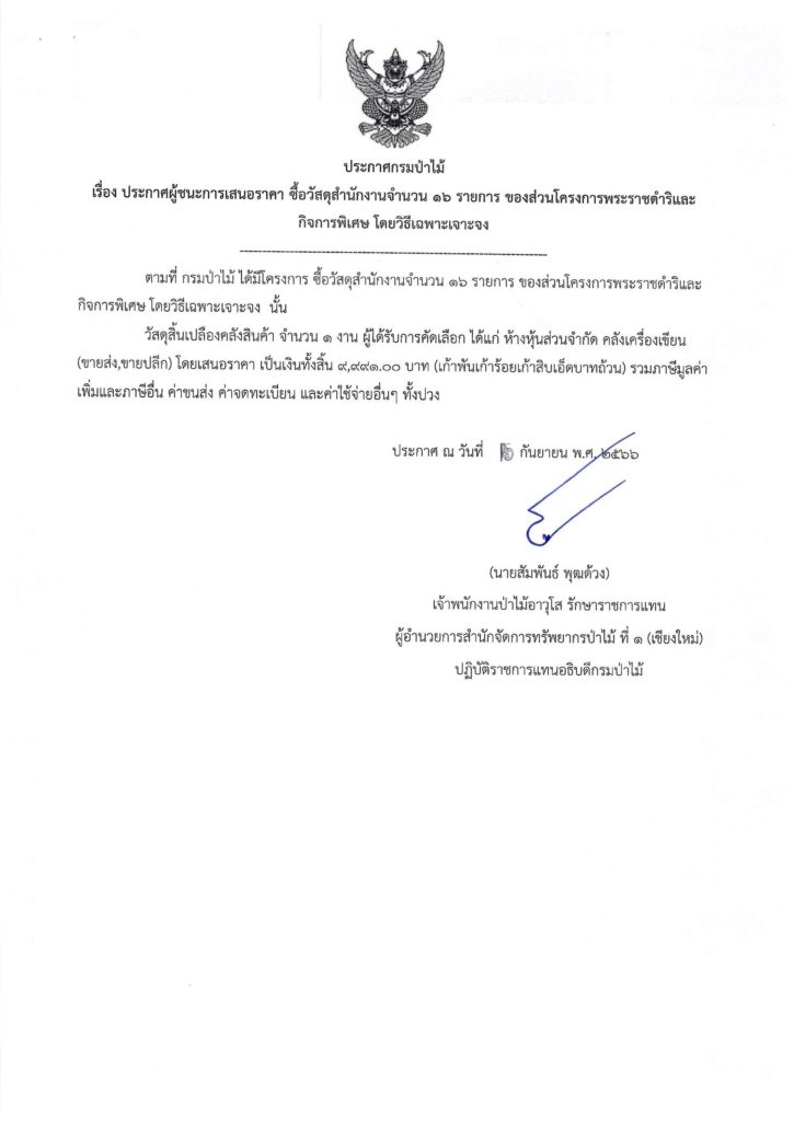 ประกาศกรมป่าไม้ เรื่อง ประกาศผู้ชนะการเสนอราคา ซื้อวัสดุสำนักงานจำนวน ๑๖ รายการ ของส่วนโครงการพระราชดำริและกิจการพิเศษ โดยวิธีเฉพาะเจาะจง6 กันยายน 2023 ใน ประกาศจัดซื้อจัดจ้าง by adminir