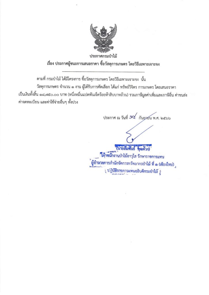 ประกาศกรมป่าไม้ เรื่อง ประกาศผู้ชนะการเสนอราคา ซื้อวัสดุการเกษตร โดยวิธีเฉพาะเจาะจง14 กันยายน 2023 ใน ประกาศจัดซื้อจัดจ้าง by adminir