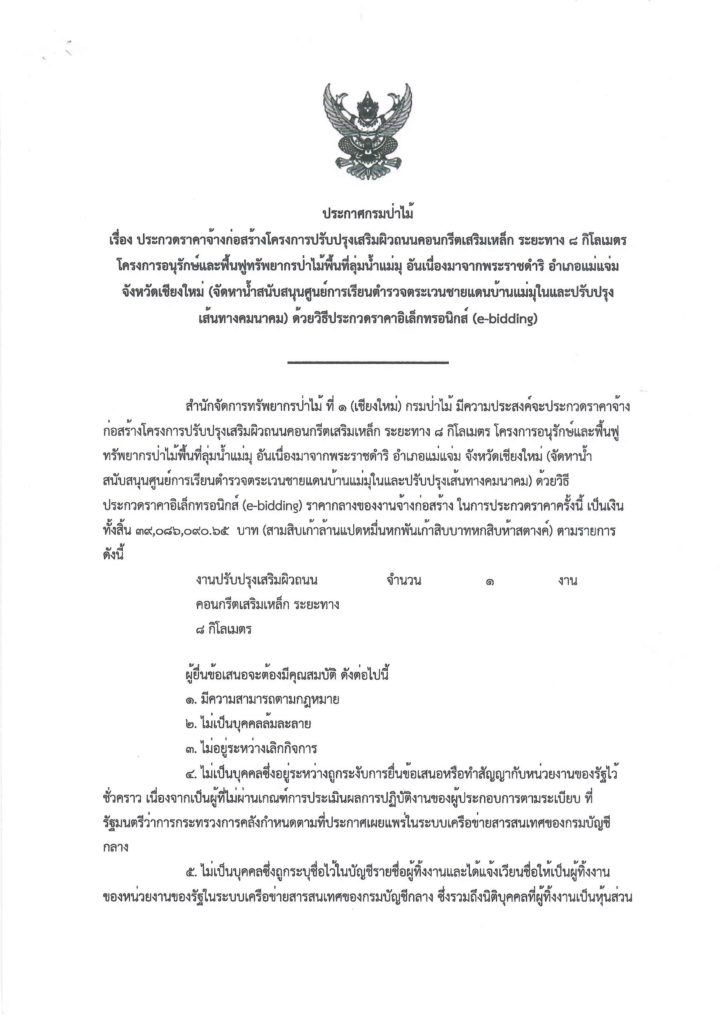 หน้าแรก » ประกาศจัดซื้อจัดจ้าง » ประกาศกรมป่าไม้ เรื่อง ประกวดราคาจ้างก่อสร้างโครงการปรับปรุงเสริมผิวถนนคอนกรีตเสริมเหล็ก ระยะทาง ๘ กิโลเมตรโครงการอนุรักษ์และฟื้นฟูทรัพยากรป่าไม้พื้นที่ลุ่มน้ำแม่มุ อันเนื่องมาจากพระราชดำริ อำเภอแม่แจ่มจังหวัดเขียงใหม่ (จัดหาน้ำสนับสนุนศูนย์การเรียนตำรวจตระเวนชายแดนบ้านแม่มุในและปรับปรุงเส้นทางคมนาคม) ด้วยวิธีประกวดราคาอิเล็กทรอนิกส์ (e-biddling)