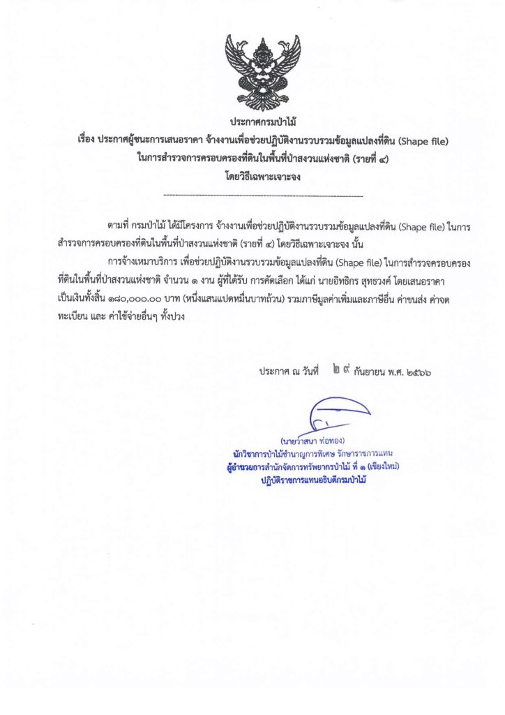 ประกาศกรมป่าไม้ เรื่อง ประกาศผู้ชนะการเสนอราคา จ้างงานเพื่อช่วยปฏิบัติงานรวบรวมข้อมูลแปลงที่ดิน (Shape file) ในการสำรวจการครอบครองที่ดินในพื้นที่ป่าสงวนแห่งชาติ (รายที่ ๔) โดยวิธีเฉพาะเจาะจง2 ตุลาคม 2023 ใน ประกาศจัดซื้อจัดจ้าง by adminir