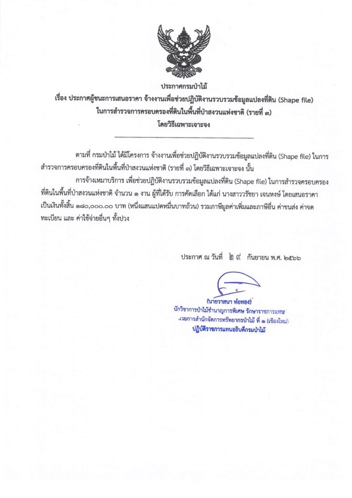 ประกาศกรมป่าไม้ เรื่อง ประกาศผู้ชนะการเสนอราคา จ้างงานเพื่อช่วยปฏิบัติงานรวบรวมข้อมูลแปลงที่ดิน (Shape file) ในการสำรวจการครอบครองที่ดินในพื้นที่ป่าสงวนแห่งชาติ (รายที่ ๓) โดยวิธีเฉพาะเจาะจง2 ตุลาคม 2023 ใน ประกาศจัดซื้อจัดจ้าง by adminir