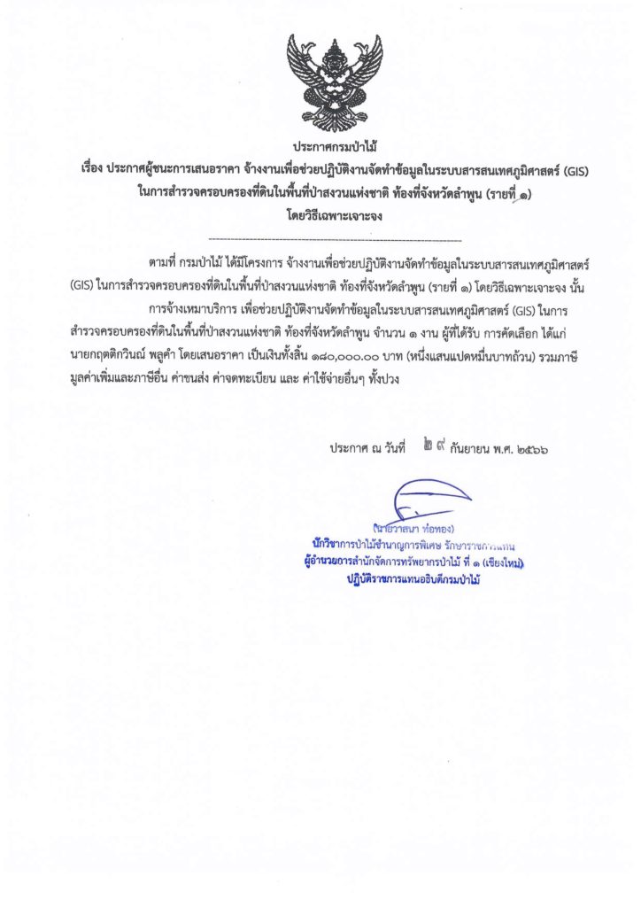 ประกาศกรมป่าไม้ เรื่อง ประกาศผู้ชนะการเสนอราคา จ้างงานเพื่อช่วยปฏิบัติงานจัดทำข้อมูลในระบบสารสนเทศภูมิศาสตร์ (GIS) ในการสำรวจครอบครองที่ดินในพื้นที่ป่าสงวนแห่งชาติ ท้องที่จังหวัดลำพูน (รายที่ ๑) โดยวิธีเฉพาะเจาะจง2 ตุลาคม 2023 ใน ประกาศจัดซื้อจัดจ้าง by adminir