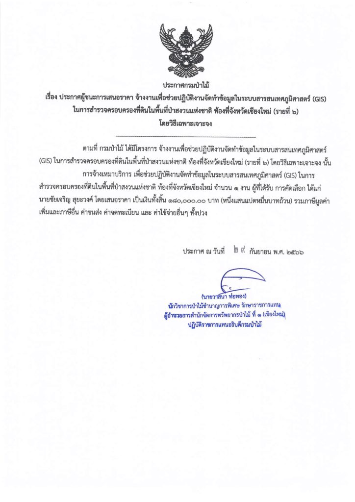 ประกาศกรมป่าไม้ เรื่อง ประกาศผู้ชนะการเสนอราคา จ้างงานเพื่อช่วยปฏิบัติงานจัดทำข้อมูลในระบบสารสนเทศภูมิศาสตร์ (GIS) ในการสำรวจครอบครองที่ดินในพื้นที่ป่าสงวนแห่งชาติ ท้องที่จังหวัดเชียงใหม่ (รายที่ ๖) โดยวิธีเฉพาะเจาะจง2 ตุลาคม 2023 ใน ประกาศจัดซื้อจัดจ้าง by adminir