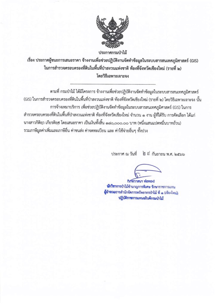 ประกาศกรมป่าไม้ เรื่อง ประกาศผู้ชนะการเสนอราคา จ้างงานเพื่อช่วยปฏิบัติงานจัดทำข้อมูลในระบบสารสนเทศภูมิศาสตร์ (GIS) ในการสำรวจครอบครองที่ดินในพื้นที่ป่าสงวนแห่งชาติ ท้องที่จังหวัดเชียงใหม่ (รายที่ ๒) โดยวิธีเฉพาะเจาะจง2 ตุลาคม 2023 ใน ประกาศจัดซื้อจัดจ้าง by adminir