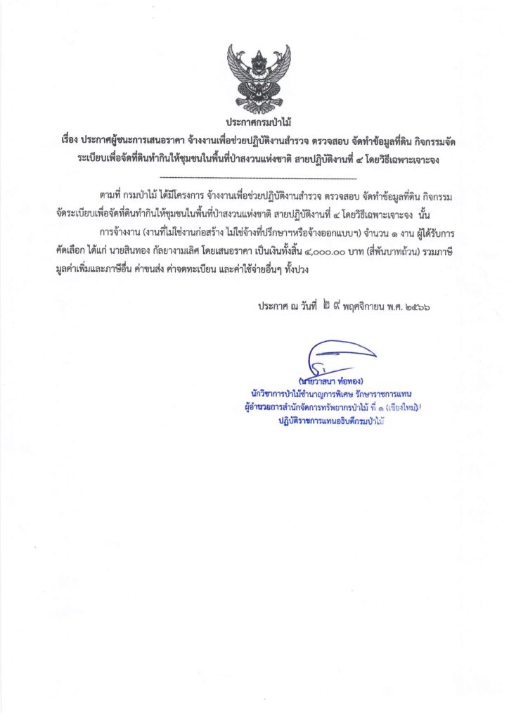 ประกาศกรมป่าไม้ เรื่อง ประกาศผู้ชนะการเสนอราคา จ้างงานเพื่อช่วยปฏิบัติงานสำรวจ ตรวจสอบ จัดทำข้อมูลที่ดิน กิจกรรมจัดระเบียบเพื่อจัดที่ดินทำกินให้ชุมชนในพื้นที่ป่าสงวนแห่งชาติ สายปฏิบัติงานที่ ๔ โดยวิธีเฉพาะเจาะจง30 พฤศจิกายน 2023 ใน ประกาศจัดซื้อจัดจ้าง by adminir