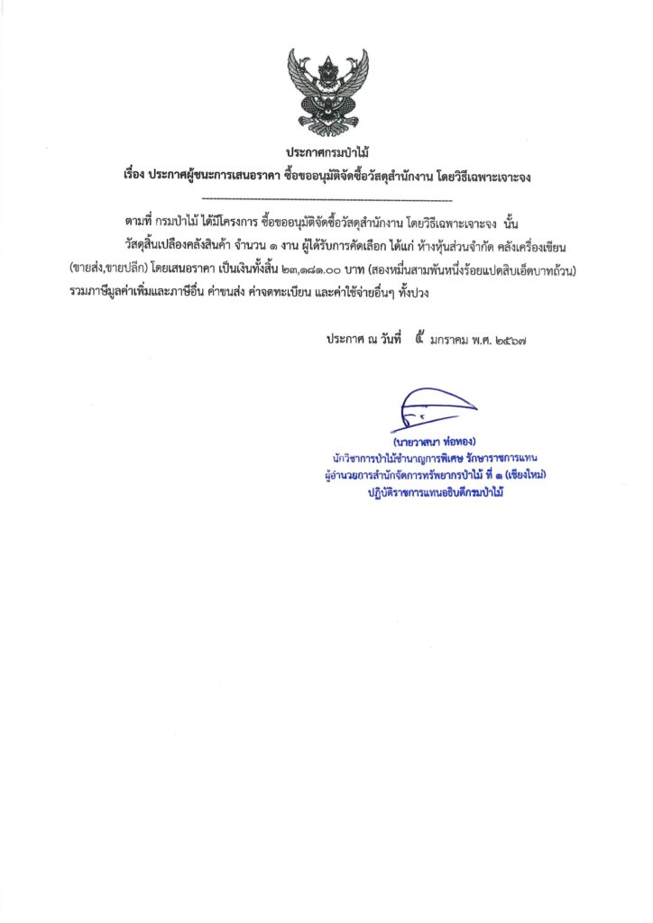 ประกาศกรมป่าไม้ เรื่อง ประกาศผู้ชนะการเสนอราคา ซื้อขออนุมัติจัดซื้อวัสดุสำนักงาน โดยวิธีเฉพาะเจาะจง5 มกราคม 2024 ใน ประกาศจัดซื้อจัดจ้าง by adminir