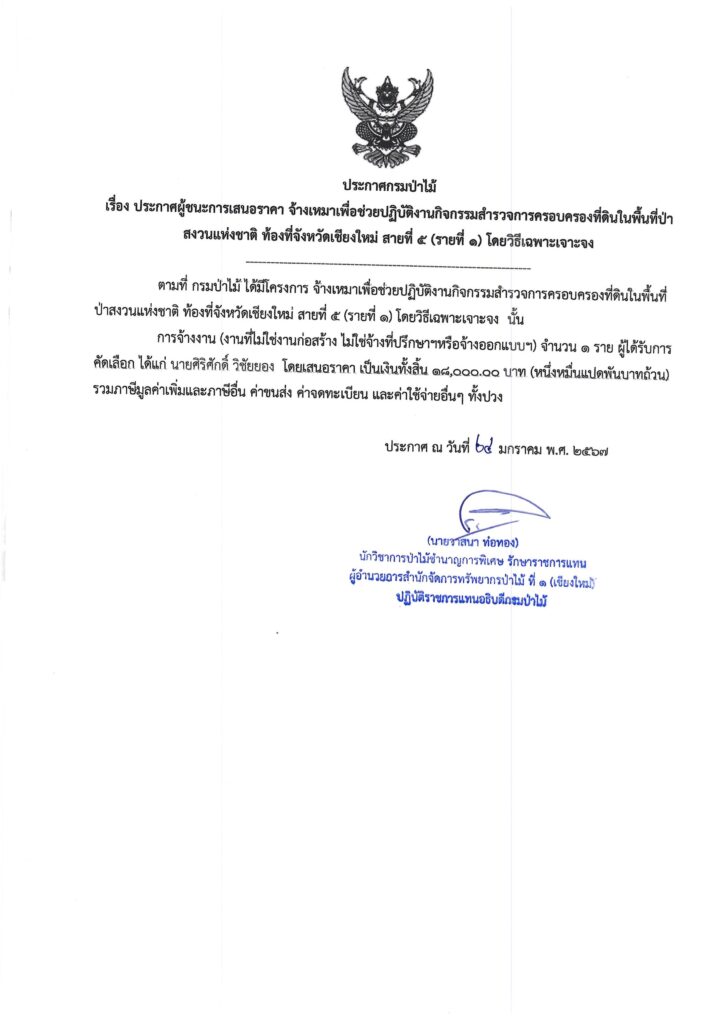 ประกาศกรมป่าไม้ เรื่อง ประกาศผู้ชนะการเสนอราคา จ้างเหมาเพื่อช่วยปฏิบัติงานกิจกรรมสำรวจการครอบครองที่ดินในพื้นที่ป่าสงวนแห่งชาติ ท้องที่จังหวัดเชียงใหม่ สายที่ ๕ (รายที่ ๑) โดยวิธีเฉพาะเจาะจง24 มกราคม 2024 ใน ประกาศจัดซื้อจัดจ้าง by adminir