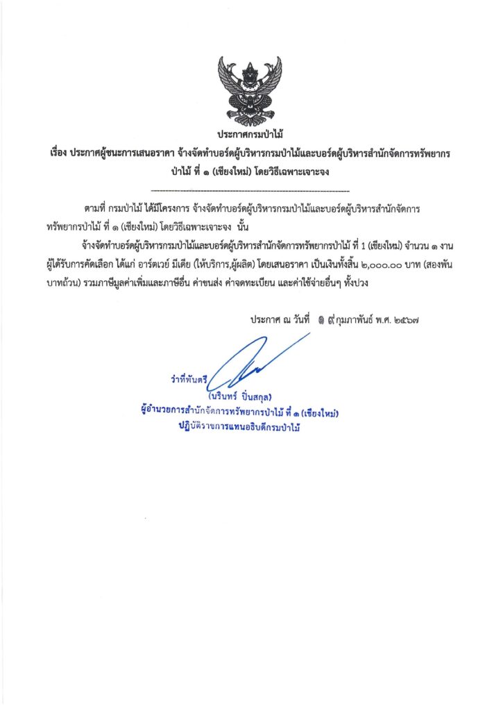 ประกาศกรมป่าไม้ เรื่อง ประกาศผู้ชนะการเสนอราคา จ้างจัดทำบอร์ดผู้บริหารกรมป่าไม้และบอร์ดผู้บริหารสำนักจัดการทรัพยากรป่าไม้ ที่ ๑ (เชียงใหม่) โดยวิธีเฉพาะเจาะจง19 กุมภาพันธ์ 2024 ใน ประกาศจัดซื้อจัดจ้าง by adminir
