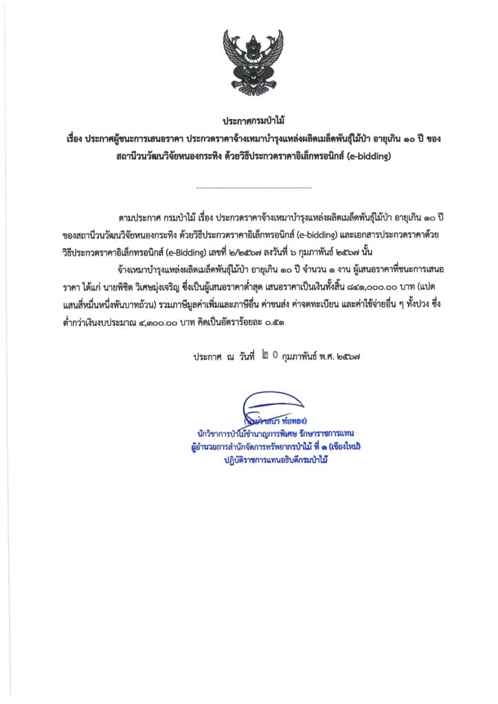 ประกาศกรมป่าไม้ เรื่อง ประกาศผู้ชนะการเสนอราคา ประกวดราคาจ้างเหมาบำรุงแหล่งผลิตเมล็ดพันธุ์ไม้ป่า อายุเกิน ๑๐ ปี ของสถานีวนวัฒนวิจัยหนองกระทิง ด้วยวิธีประกวดราคาอิเล็กทรอนิกส์ (e-bidding)20 กุมภาพันธ์ 2024 ใน ประกาศจัดซื้อจัดจ้าง by adminir