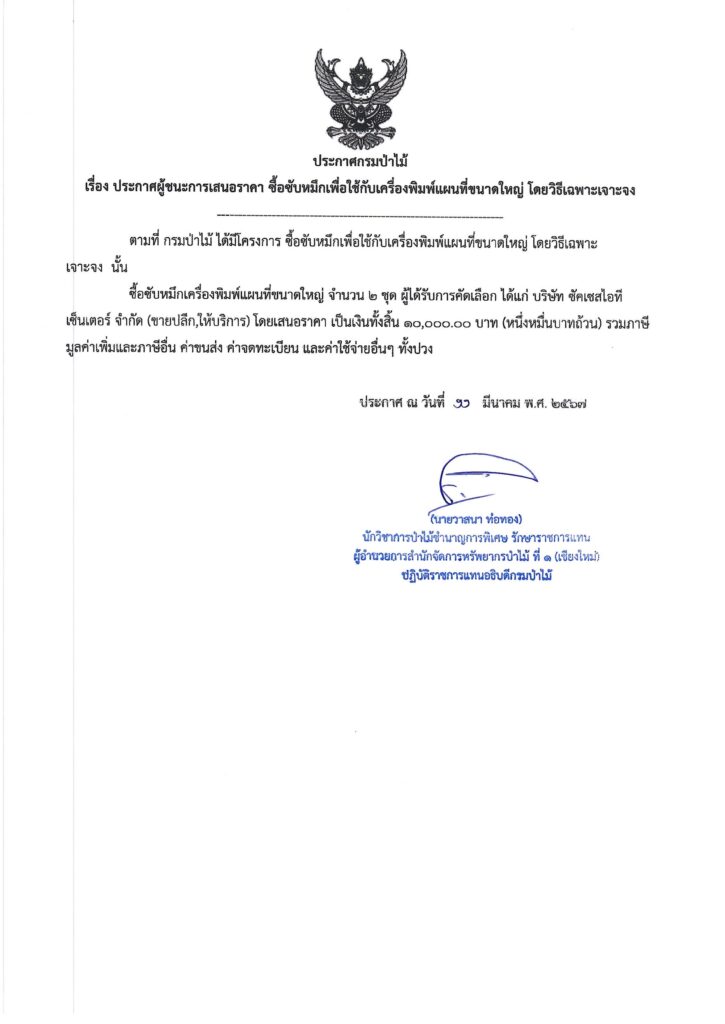 ประกาศกรมป่าไม้ เรื่อง ประกาศผู้ชนะการเสนอราคา ซื้อซับหมึกเพื่อใช้กับเครื่องพิมพ์แผนที่ขนาดใหญ่ โดยวิธีเฉพาะเจาะจง11 มีนาคม 2024 ใน ประกาศจัดซื้อจัดจ้าง by adminir