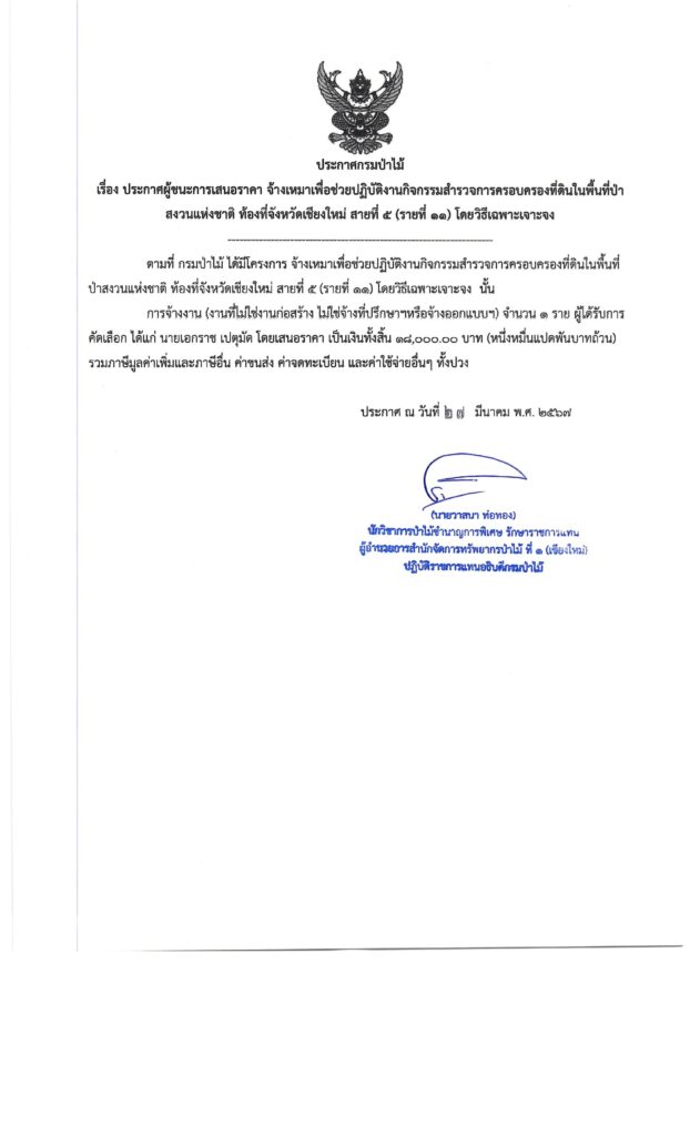 ประกาศกรมป่าไม้ เรื่อง ประกาศผู้ชนะการเสนอราคา จ้างเหมาเพื่อช่วยปฏิบัติงานกิจกรรมสำรวจการครอบครองที่ดินในพื้นที่ป่าสงวนแห่งชาติ ท้องที่จังหวัดเชียงใหม่ สายที่ ๕ (รายที่ ๑๑) โดยวิธีเฉพาะเจาะจง29 มีนาคม 2024 ใน ประกาศจัดซื้อจัดจ้าง by adminir