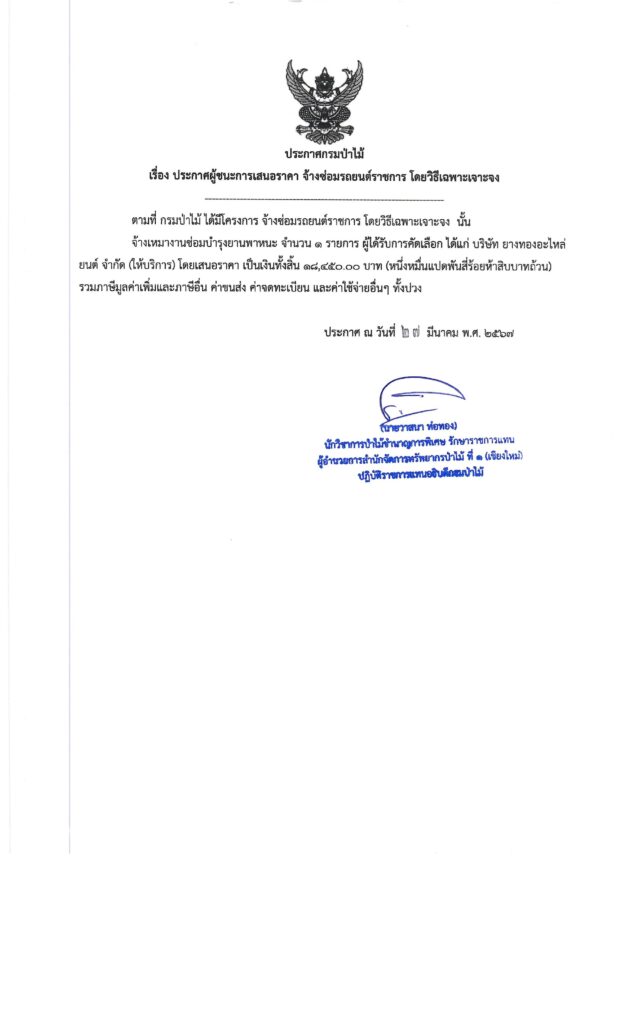ประกาศกรมป่าไม้ เรื่อง ประกาศผู้ชนะการเสนอราคา จ้างซ่อมรถยนต์ราชการ โดยวิธีเฉพาะเจาะจง29 มีนาคม 2024 ใน ประกาศจัดซื้อจัดจ้าง by adminir