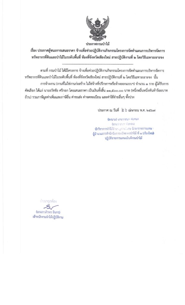 ประกาศกรมป่าไม้ เรื่อง ประกาศผู้ชนะการเสนอราคา จ้างเพื่อช่วยปฏิบัติงานกิจกรรมโครงการจัดทำแผนการบริหารจัดการทรัพยากรที่ดินและป่าไม้ในระดับพื้นที่ ท้องที่จังหวัดเชียงใหม่ สายปฏิบัติงานที่ ๒ โดยวิธีเฉพาะเจาะจง
