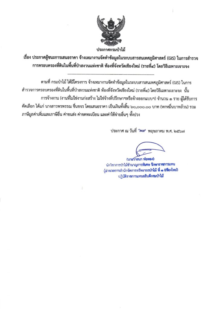 ประกาศกรมป่าไม้ เรื่อง ประกาศผู้ชนะการเสนอราคา จ้างเหมางานจัดทำข้อมูลในระบบสารสนเทศภูมิศาสตร์ (GIS) ในการสำรวจการครอบครองที่ดินในพื้นที่ป่าสงวนแห่งชาติ ท้องที่จังหวัดเชียงใหม่ (รายที่ ๔) โดยวิธีเฉพาะเจาะจง29 พฤษภาคม 2024 ใน ประกาศจัดซื้อจัดจ้าง by adminir