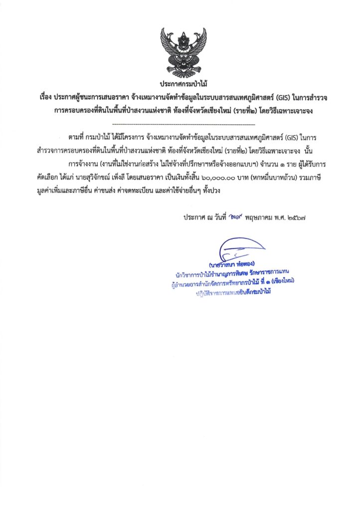 ประกาศกรมป่าไม้ เรื่อง ประกาศผู้ชนะการเสนอราคา จ้างเหมางานจัดทำข้อมูลในระบบสารสนเทศภูมิศาสตร์ (GIS) ในการสำรวจการครอบครองที่ดินในพื้นที่ป่าสงวนแห่งชาติ ท้องที่จังหวัดเชียงใหม่ (รายที่๒) โดยวิธีเฉพาะเจาะจง29 พฤษภาคม 2024 ใน ประกาศจัดซื้อจัดจ้าง by adminir