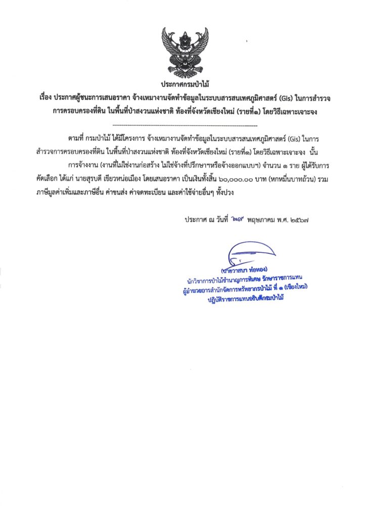 ประกาศกรมป่าไม้ เรื่อง ประกาศผู้ชนะการเสนอราคา จ้างเหมางานจัดทำข้อมูลในระบบสารสนเทศภูมิศาสตร์ (Gis) ในการสำรวจการครอบครองที่ดิน ในพื้นที่ป่าสงวนแห่งชาติ ท้องที่จังหวัดเชียงใหม่ (รายที่๑) โดยวิธีเฉพาะเจาะจง29 พฤษภาคม 2024 ใน ประกาศจัดซื้อจัดจ้าง by adminir