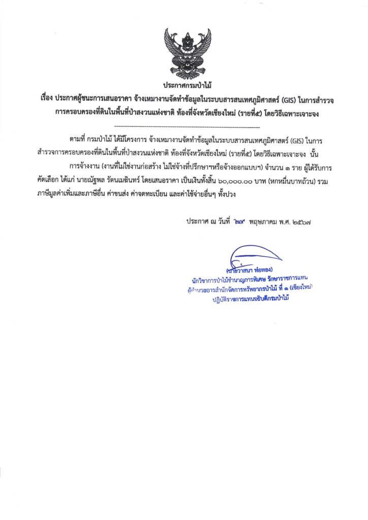 ประกาศกรมป่าไม้ เรื่อง ประกาศผู้ชนะการเสนอราคา จ้างเหมางานจัดทำข้อมูลในระบบสารสนเทศภูมิศาสตร์ (GIS) ในการสำรวจการครอบครองที่ดินในพื้นที่ป่าสงวนแห่งชาติ ท้องที่จังหวัดเชียงใหม่ (รายที่๕) โดยวิธีเฉพาะเจาะจง29 พฤษภาคม 2024 ใน ประกาศจัดซื้อจัดจ้าง by adminir