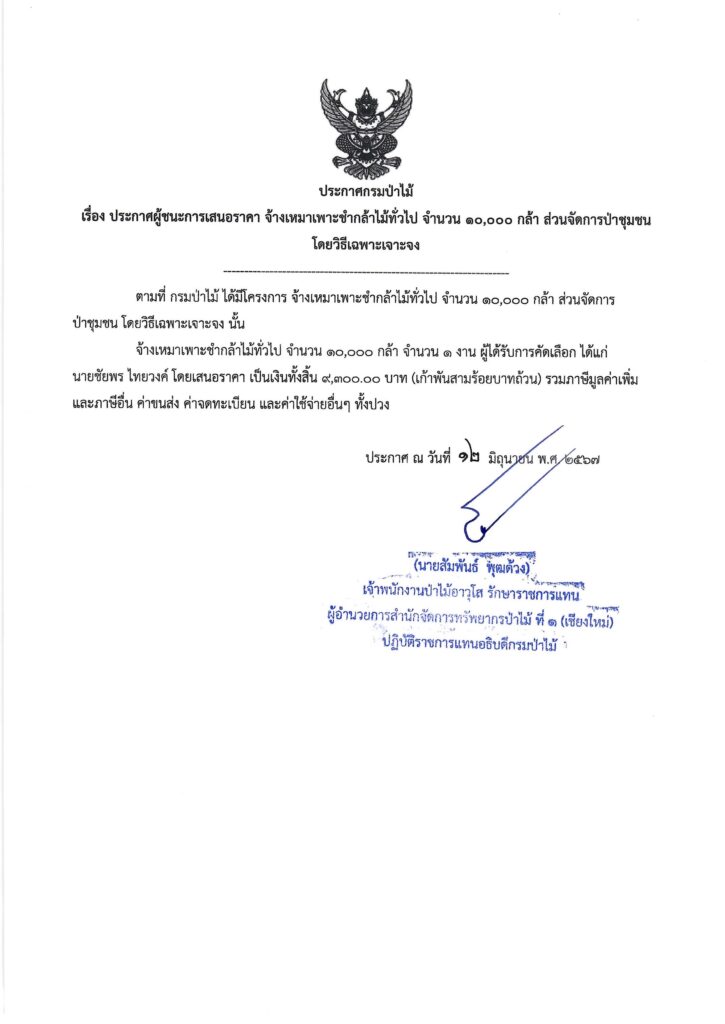 ประกาศกรมป่าไม้ เรื่อง ประกาศผู้ชนะการเสนอราคา จ้างเหมาเพาะชำกล้าไม้ทั่วไป จำนวน ๑๐,๐๐๐ กล้า ส่วนจัดการป่าชุมชนโดยวิธีเฉพาะเจาะจง12 มิถุนายน 2024 ใน ประกาศจัดซื้อจัดจ้าง by adminir