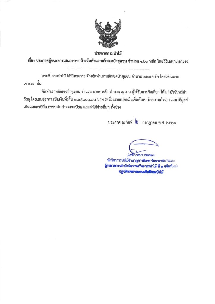 ประกาศกรมป่าไม้ เรื่อง ประกาศผู้ชนะการเสนอราคา จ้างจัดทำเสาหลักเขตป่าชุมชน จำนวน ๔๖๙ หลัก โดยวิธีเฉพาะเจาะจง3 กรกฎาคม 2024 ใน ประกาศจัดซื้อจัดจ้าง by adminir