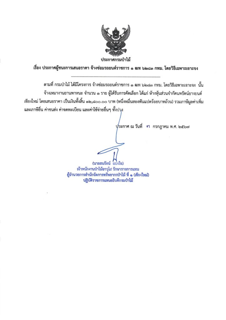 ประกาศกรมป่าไม้ เรื่อง ประกาศผู้ชนะการเสนอราคา จ้างซ่อมรถยนต์ราชการ ๒ ฒท ๖๒๘๓ กทม. โดยวิธีเฉพาะเจาะจง4 กรกฎาคม 2024 ใน ประกาศจัดซื้อจัดจ้าง by adminir