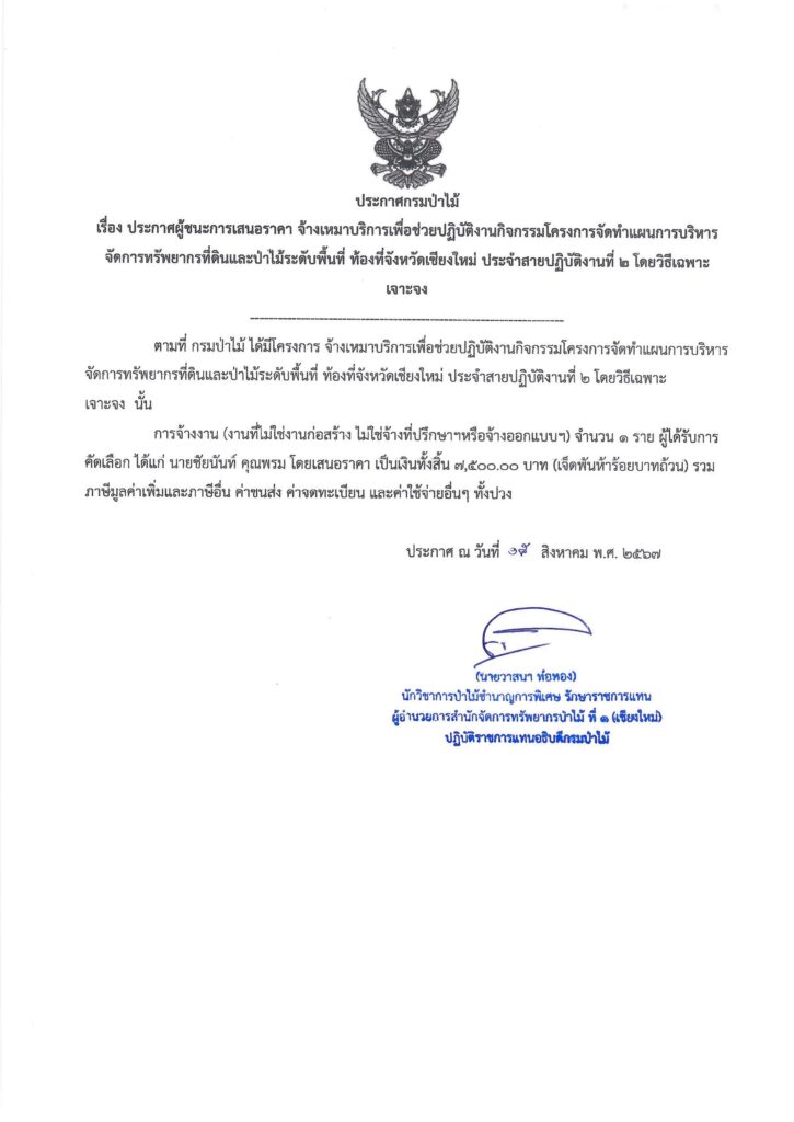 ประกาศกรมป่าไม้ เรื่อง ประกาศผู้ชนะการเสนอราคา จ้างเหมาบริการเพื่อช่วยปฏิบัติงานกิจกรรมโครงการจัดทำแผนการบริหารจัดการทรัพยากรที่ดินและป่าไม้ระดับพื้นที่ ท้องที่จังหวัดเชียงใหม่ ประจำสายปฏิบัติงานที่ ๒ โดยวิธีเฉพาะเจาะจง