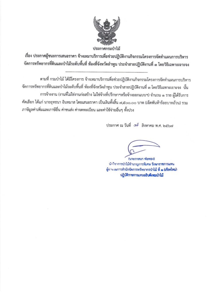 ประกาศกรมป่าไม้ เรื่อง ประกาศผู้ชนะการเสนอราคา จ้างเหมาบริการเพื่อช่วยปฏิบัติงานกิจกรรมโครงการจัดทำแผนการบริหารจัดการทรัพยากรที่ดินและป้าไม้ระดับพื้นที่ ท้องที่จังหวัดลำพูน ประจำสายปฏิบัติงานที่ ๓ โดยวิธีเฉพาะเจาะจง19 สิงหาคม 2024 ใน ประกาศผู้ชนะการเสนอราคา by adminir