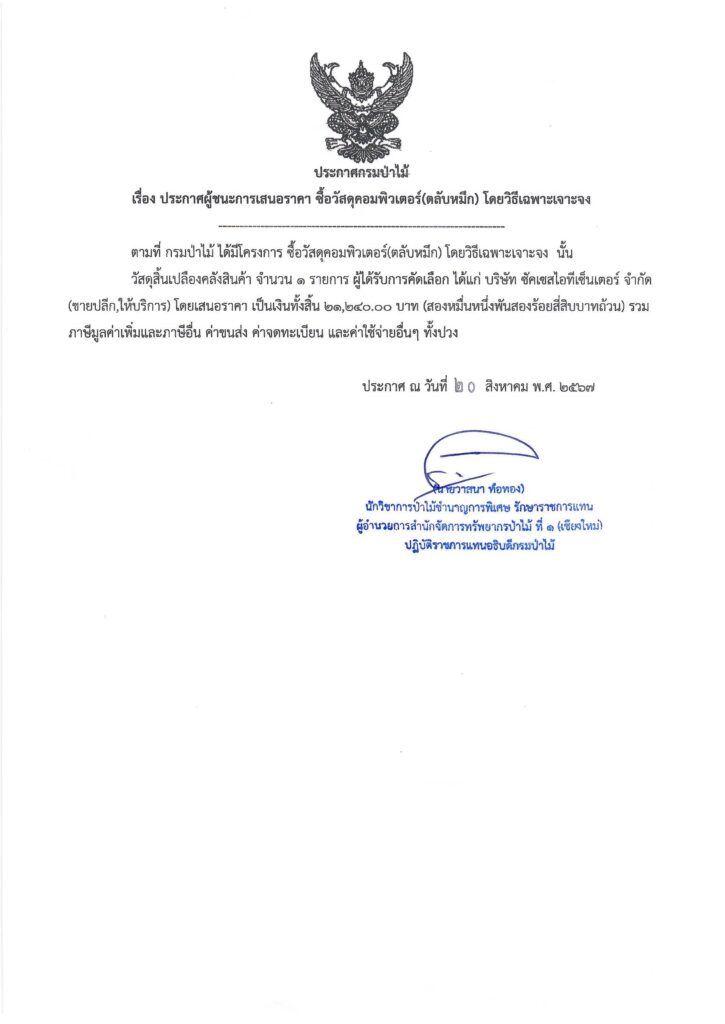 ประกาศกรมป่าไม้ เรื่อง ประกาศผู้ชนะการเสนอราคา ซื้อวัสดุคอมพิวเตอร์(ตลับหมึก) โดยวิธีเฉพาะเจาะจง20 สิงหาคม 2024 ใน ประกาศผู้ชนะการเสนอราคา by adminir