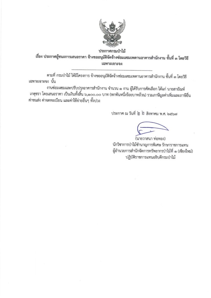 ประกาศกรมป่าไม้ เรื่อง ประกาศผู้ชนะการเสนอราคา จ้างขออนุมัติจัดจ้างซ่อมแชมเพดานอาคารสำนักงาน ชั้นที่ ๓ โดยวิธีเฉพาะเจาะจง22 สิงหาคม 2024 ใน ประกาศผู้ชนะการเสนอราคา by adminir