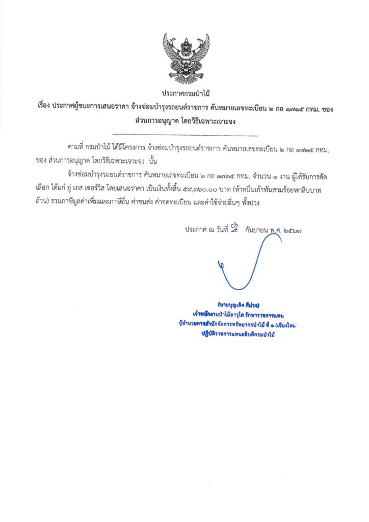 ประกาศกรมป่าไม้ เรื่อง ประกาศผู้ชนะการเสนอราคา จ้างซ่อมบำรุงรถยนต์ราชการ คันหมายเลขทะเบียน ๒ กถ ๑๗๑๕ กทม. ของส่วนการอนุญาต โดยวิธีเฉพาะเจาะจง5 กันยายน 2024 ใน ประกาศผู้ชนะการเสนอราคา by adminir