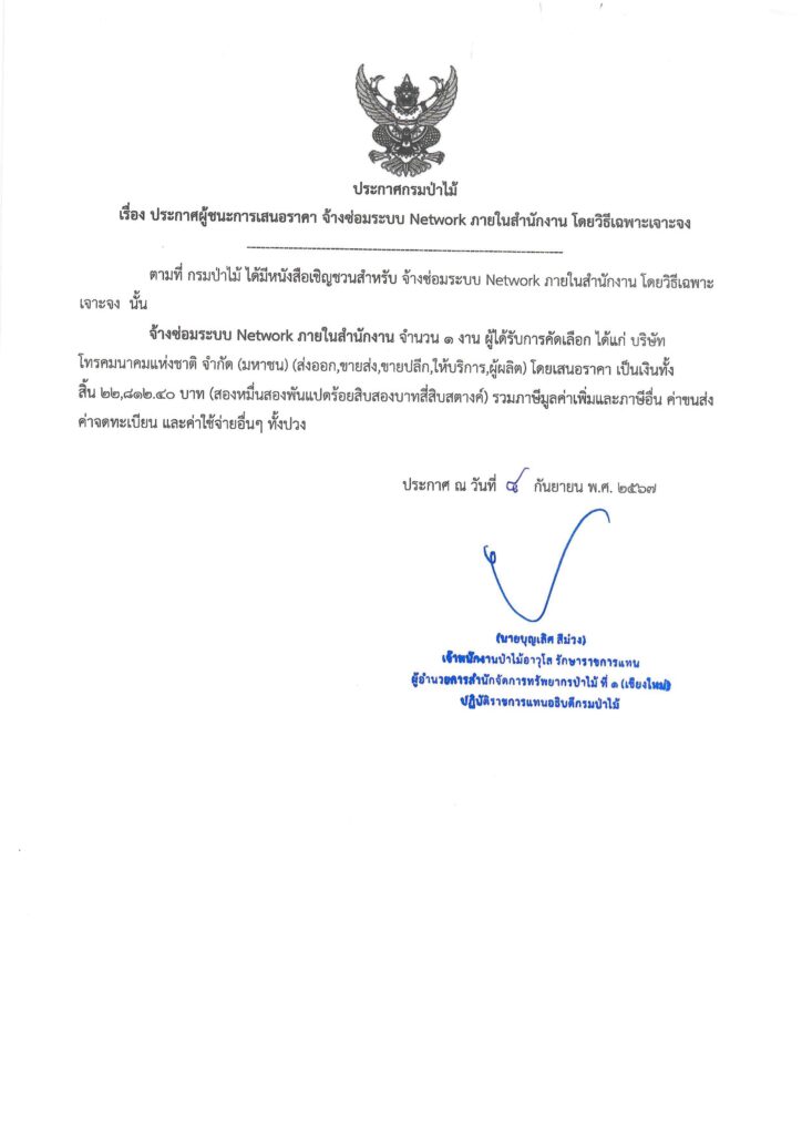 ประกาศกรมป่าไม้ เรื่อง ประกาศผู้ชนะการเสนอราคา จ้างซ่อมระบบ Network ภายในสำนักงาน โดยวิธีเฉพาะเจาะจง5 กันยายน 2024 ใน ประกาศผู้ชนะการเสนอราคา by adminir