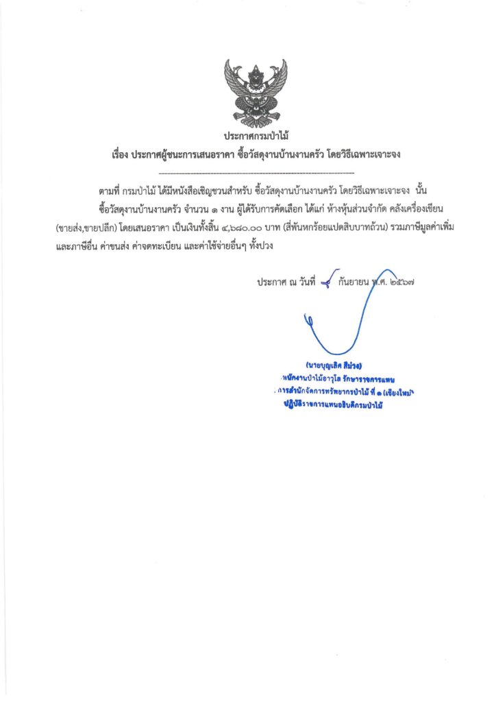 ประกาศกรมป่าไม้ เรื่อง ประกาศผู้ชนะการเสนอราคา ซื้อวัสดุงานบ้านงานครัว โดยวิธีเฉพาะเจาะจง5 กันยายน 2024 ใน ประกาศผู้ชนะการเสนอราคา by adminir