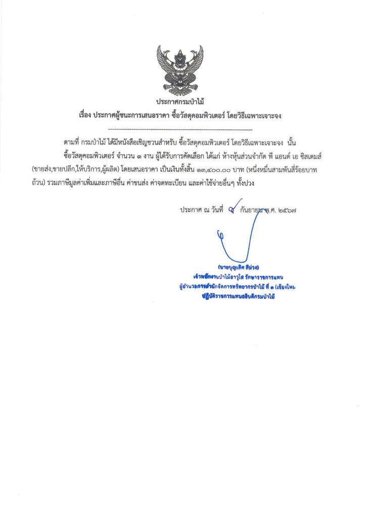 ประกาศกรมป่าไม้ เรื่อง ประกาศผู้ชนะการเสนอราคา ซื้อวัสดุคอมพิวเตอร์ โดยวิธีเฉพาะจง5 กันยายน 2024 ใน ประกาศผู้ชนะการเสนอราคา by adminir