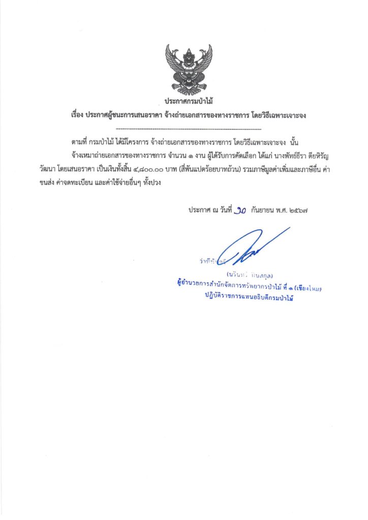ประกาศกรมป่าไม้ เรื่อง ประกาศผู้ชนะการเสนอราคา จ้างถ่ายเอกสารของทางราชการ โดยวิธีเฉพาะเจาะจง11 กันยายน 2024 ใน ประกาศผู้ชนะการเสนอราคา by adminir