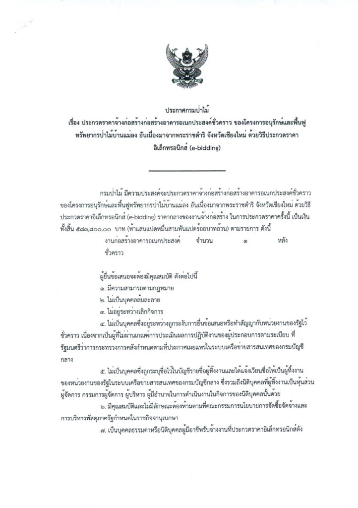 ประกาศกรมป่าไม้ เรื่อง ประกวดราคาจ้างก่อสร้างอาคารอเนกประสงค์ชั่วคราว ของโครงการอนุรักษ์และฟื้นฟูทรัพยากรป่าไม้บ้านแม่ลง อันเนื่องมาจากพระราชดำริ จังหวัดเชียงใหม่ ด้วยวิธีประกวดราคาอิเล็กทรอนิกส์ (e-bidding)