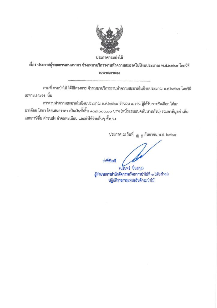 ประกาศกรมป่าไม้ เรื่อง ประกาศผู้ชนะการเสนอราคา จ้างเหมาบริการงานทำความสะอาดในปีงบประมาณ พ.ศ.๒๕๖๘ โดยวิธีเฉพาะเจาะจง