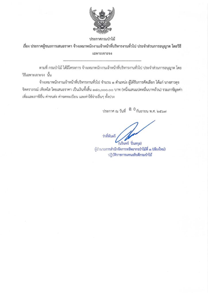 ประกาศกรมป่าไม้ เรื่อง ประกาศผู้ชนะการเสนอราคา จ้างเหมาพนักงานเจ้าหน้าที่บริหารงานทั่วไป ประจำส่วนการอนุญาต โดยวิธีเฉพาะเจาะจง30 กันยายน 2024 ใน ประกาศจัดซื้อจัดจ้าง / ประกาศผู้ชนะการเสนอราคา by adminir