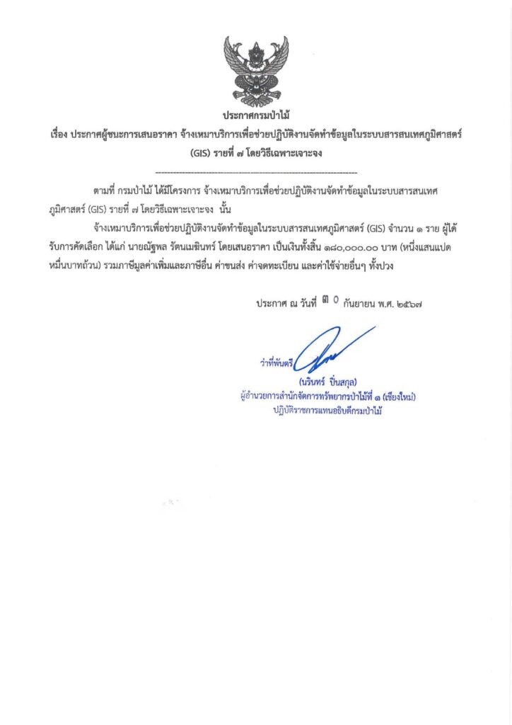 ประกาศกรมป่าไม้ เรื่อง ประกาศผู้ชนะการเสนอราคา จ้างเหมาบริการเพื่อช่วปฏิบัติงานจัดทำข้อมูลในระบบสารสนเทศภูมิศาสตร์(GIS) รายที่ ๗ โดยวิธีเฉพาะเจาะจง