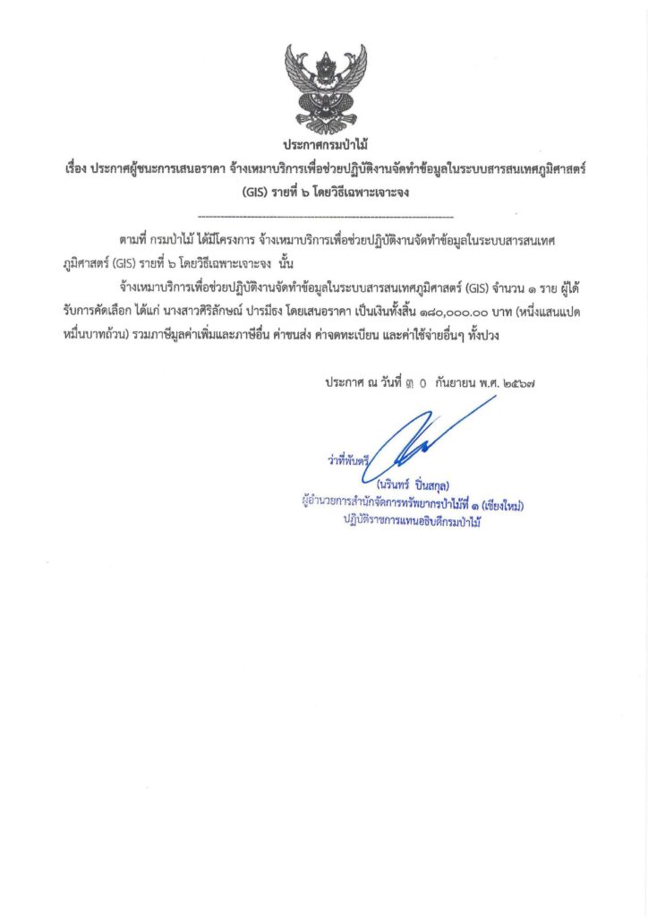 ประกาศกรมป่าไม้ เรื่อง ประกาศผู้ชนะการเสนอราคา จ้างเหมาบริการเพื่อช่วยปฏิบัติงานจัดทำข้อมูลในระบบสารสนเทศภูมิศาสตร์(GIS) รายที่ ๖ โดยวิธีเฉพาะเจาะจง30 กันยายน 2024 ใน ประกาศจัดซื้อจัดจ้าง / ประกาศผู้ชนะการเสนอราคา by adminir