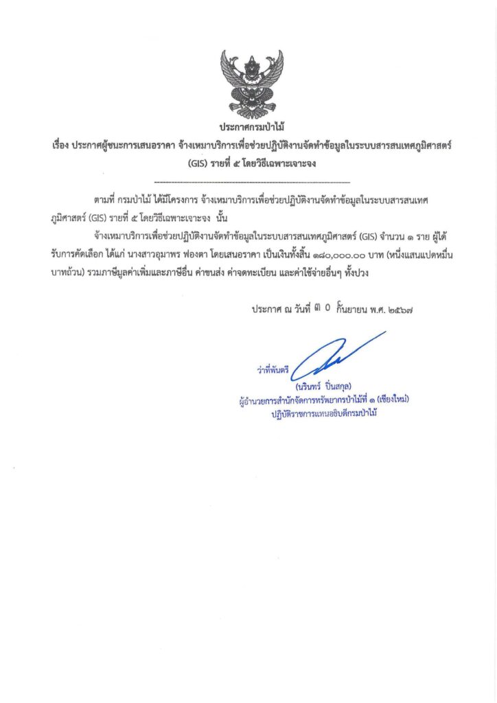 ประกาศกรมป่าไม้ เรื่อง ประกาศผู้ชนะการเสนอราคา จ้างเหมาบริการเพื่อช่วยปฏิบัติงานจัดทำข้อมูลในระบบสารสนเทศภูมิศาสตร์(GIS) รายที่ ๕ โดยวิธีเฉพาะเจาะจง30 กันยายน 2024 ใน ประกาศจัดซื้อจัดจ้าง / ประกาศผู้ชนะการเสนอราคา by adminir