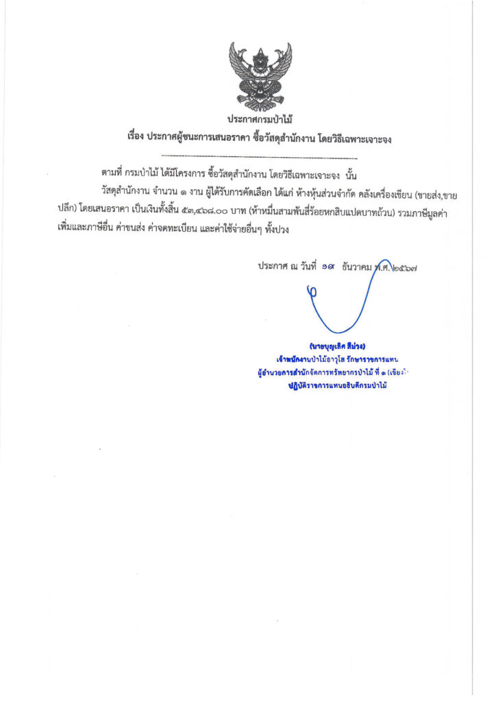 ประกาศกรมป่าไม้ เรื่อง ประกาศผู้ชนะการเสนอราคา ซื้อวัสดุสำนักงาน โดยวิธีเฉพาะเจาะจง19 ธันวาคม 2024 ใน ประกาศจัดซื้อจัดจ้าง / ประกาศผู้ชนะการเสนอราคา by adminir