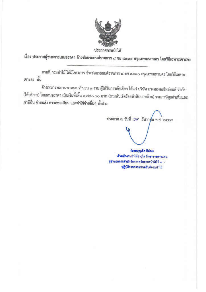ประกาศกรมป่าไม้ เรื่อง ประกาศผู้ชนะการเสนอราคา จ้างซ่อมรถยนต์ราชการ ๘ ขย ๘๓๓๐ กรุงเทพมหานคร โดยวิธีเฉพาะเจาะจง19 ธันวาคม 2024 ใน ประกาศจัดซื้อจัดจ้าง / ประกาศผู้ชนะการเสนอราคา by adminir