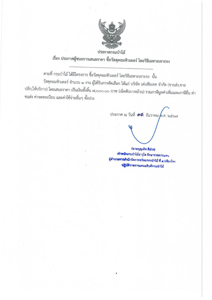 ประกาศกรมป่าไม้ เรื่อง ประกาศผู้ชนะการเสนอราคา ซื้อวัสดุคอมพิวเตอร์ โดยวิธีเฉพาะจง19 ธันวาคม 2024 ใน ประกาศจัดซื้อจัดจ้าง / ประกาศผู้ชนะการเสนอราคา by adminir